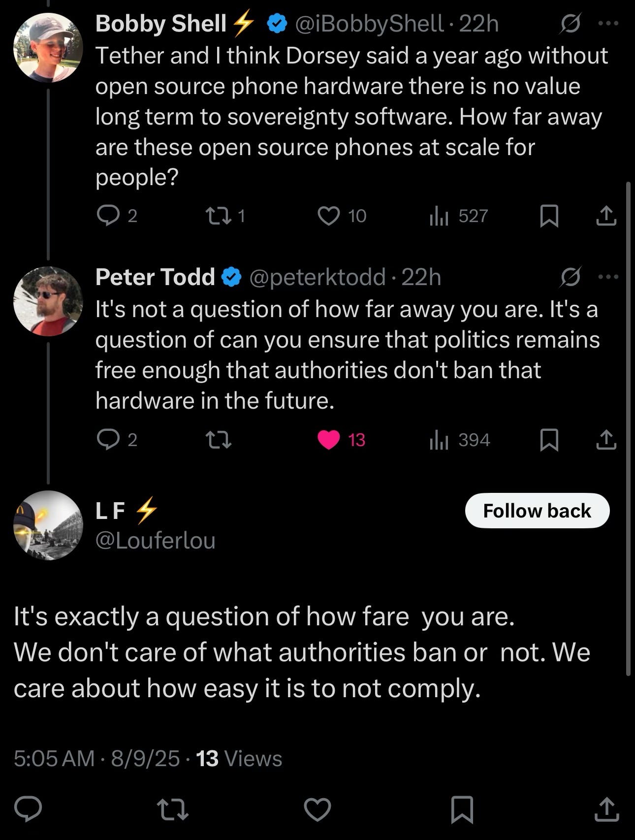 Another reply argued the opposite focus: it is about how quickly we can build and deploy the tools. Governments will always have bans, restrictions, and regulations. What matters most is building hardware and software that make it easy for people to resist bad laws—tools that give individuals control regardless of political approval. This is the “build it so we can’t be stopped” approach.